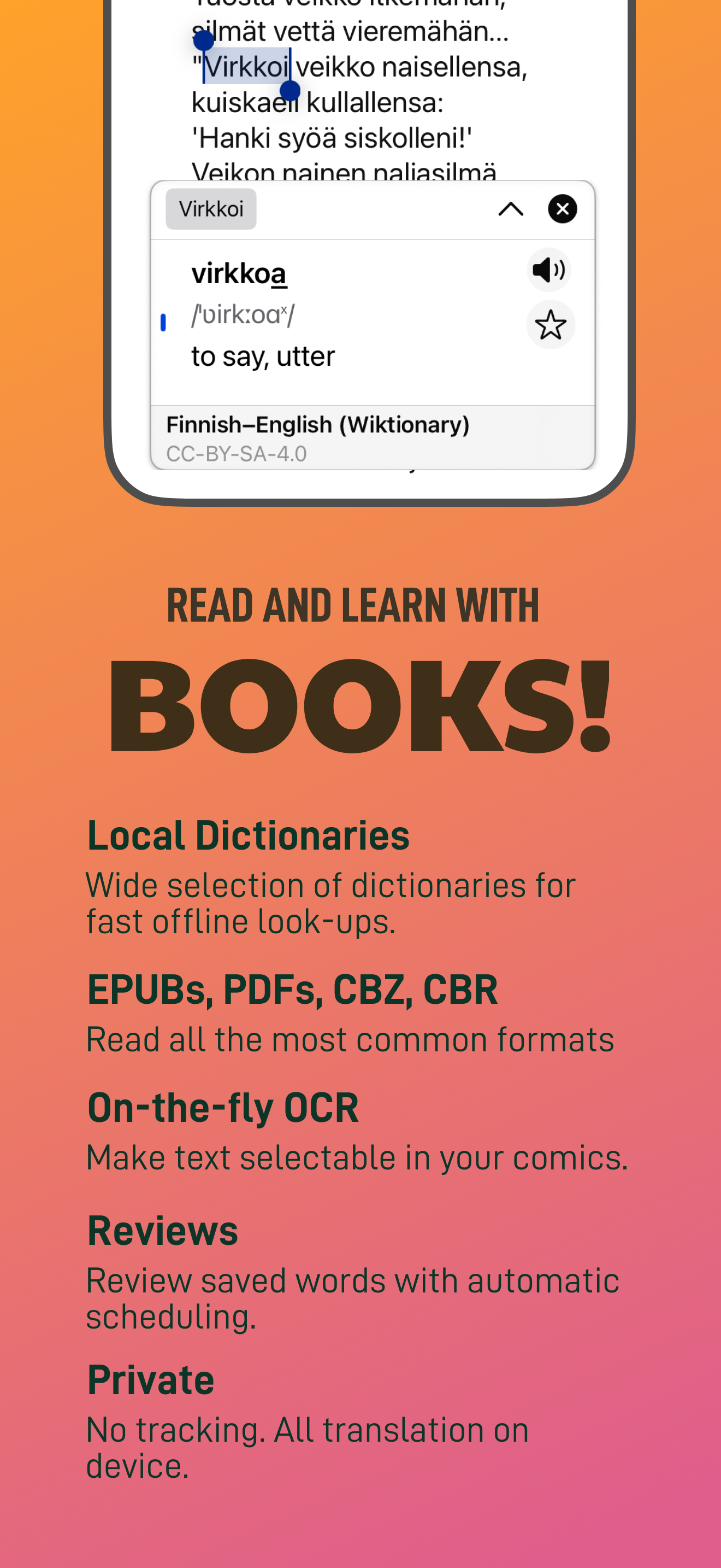 Turn any reading session into a learning session. Pino is a lightweight reader and dictionary hub that lets you look up words instantly, install the sources you trust, and build a personal vocabulary—without breaking your flow.